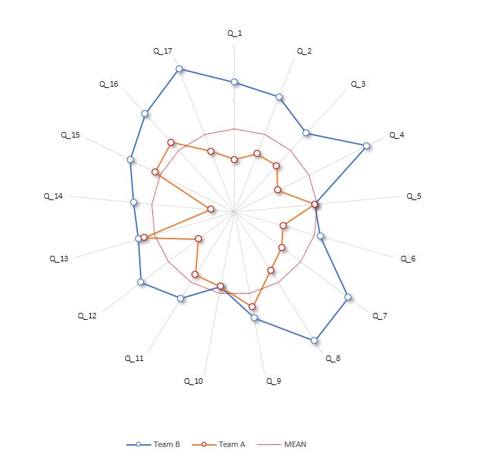 The graphic compares two teams' performance to a baseline, calculated from a 17-question survey. Each dot indicates deviation from the baseline, illustrating performance disparities clearly.
